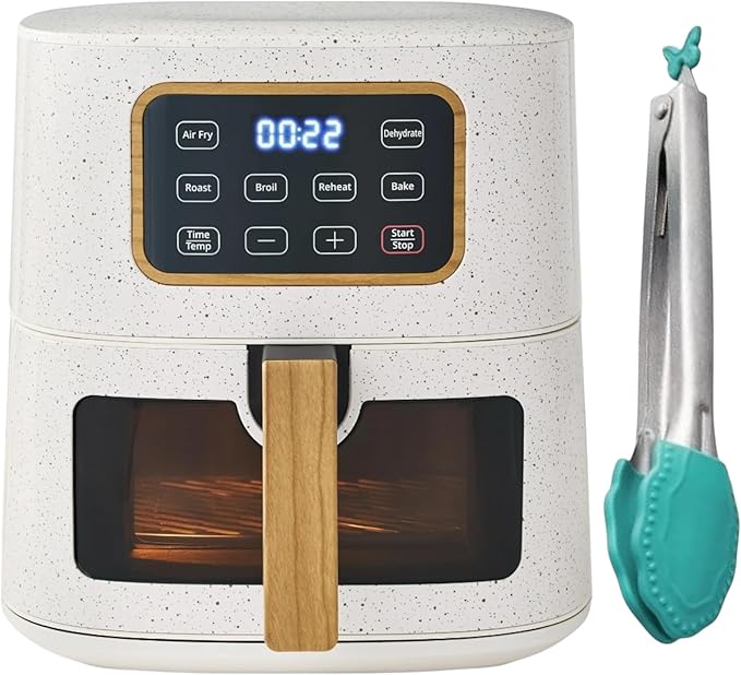 Pioneer Woman 5.8 qt Air Fryer, Linen Speckle - Energy Efficient With Rust Resistant Stainless Steel Serving Tong Bundle