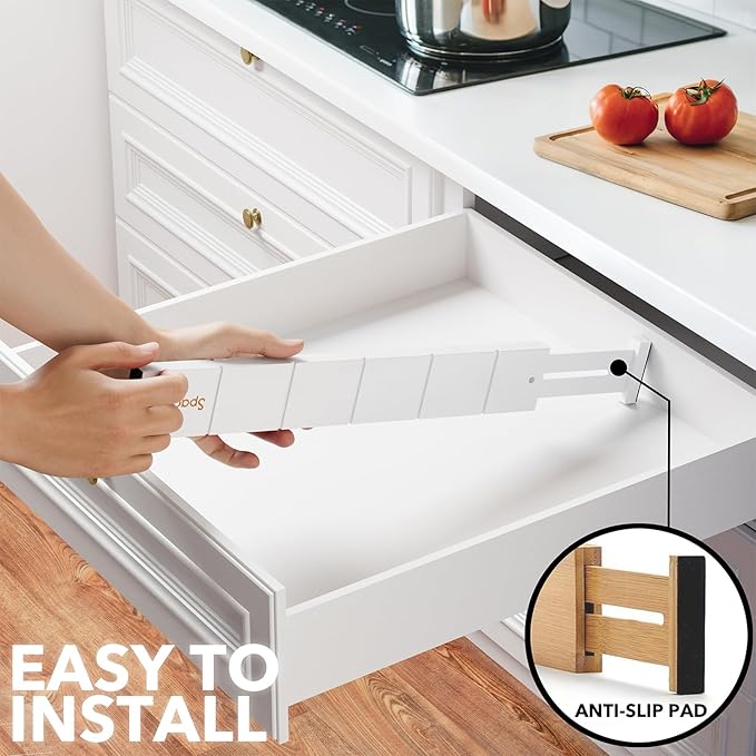 SpaceAid Bamboo Drawer Dividers with Inserts and Labels, Kitchen Adjustable Drawer Organizers, Expandable Organization for Home, Office, Dressers, 7 Dividers with 15 Inserts (17"-22" White)
