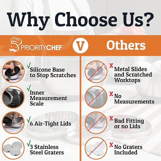 Priority Chef Stainless Steel Mixing Bowls with Lids Set - Premium 30Pcs with 6pc Metal Bowl Set for Kitchen, 3 Graters, Airtight Lids, Non-Slip Bases & Silicone Utensils, Black