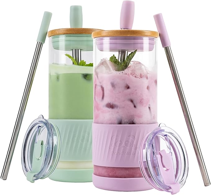 Pandaloo® Glass Cups With Lids and Straws -20 Fl Oz- Perfect Size Iced Coffee Cup - Smoothie Cup With Bamboo Lid and On the go Lid - Glass Tumbler (2 Count (Pack of 1), Lilac-Sage)