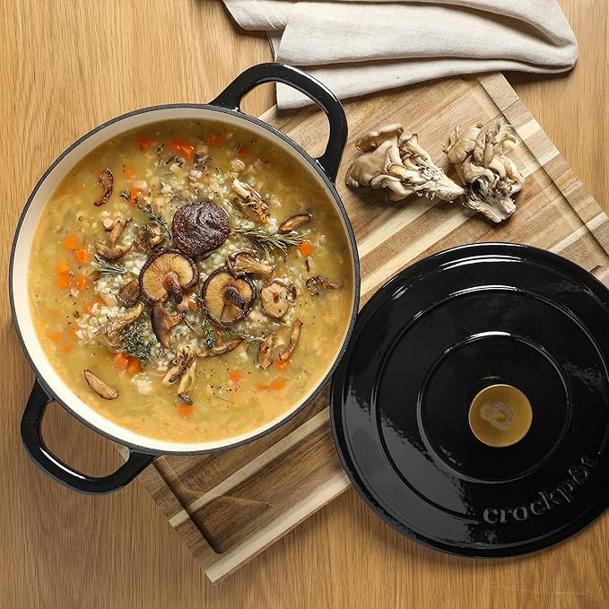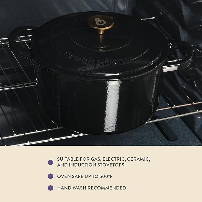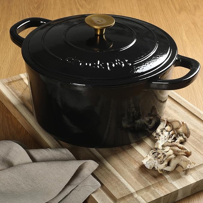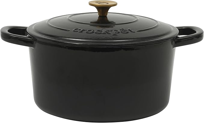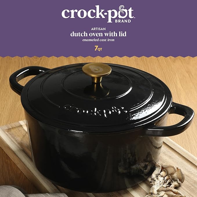 Crock Pot Artisan 7-Quart Round Cast Iron Dutch Oven with Lid – Black Enamel Finish, Gold Knob, Durable Heavy-Duty Cookware for Slow Cooking, Baking, and Roasting