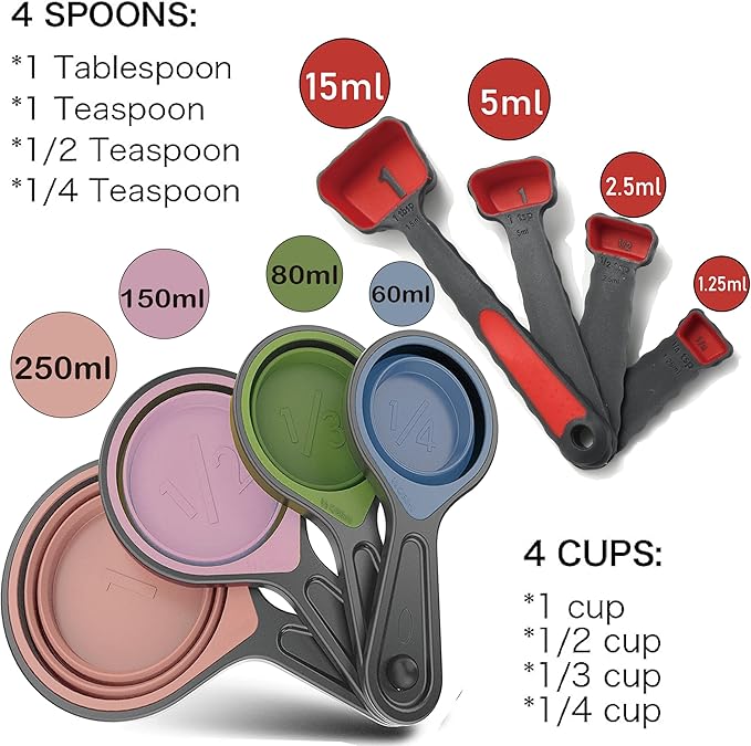 Collapsible Silicone Soft Measuring Cups and Measuring Spoons,8 pieces Portable Food Grade Silicone Cup for Liquid & Dry Measuring Baking &Utensils & Travel Measuring Cup,space saver (Pink)