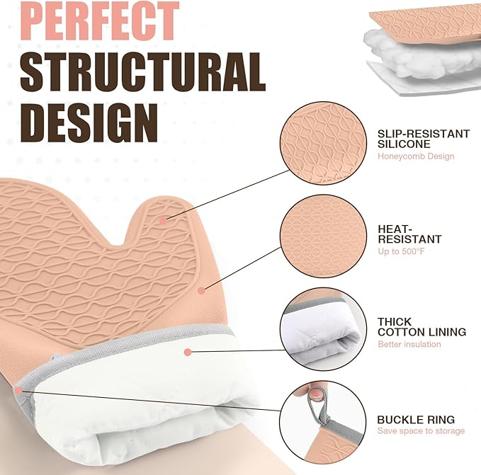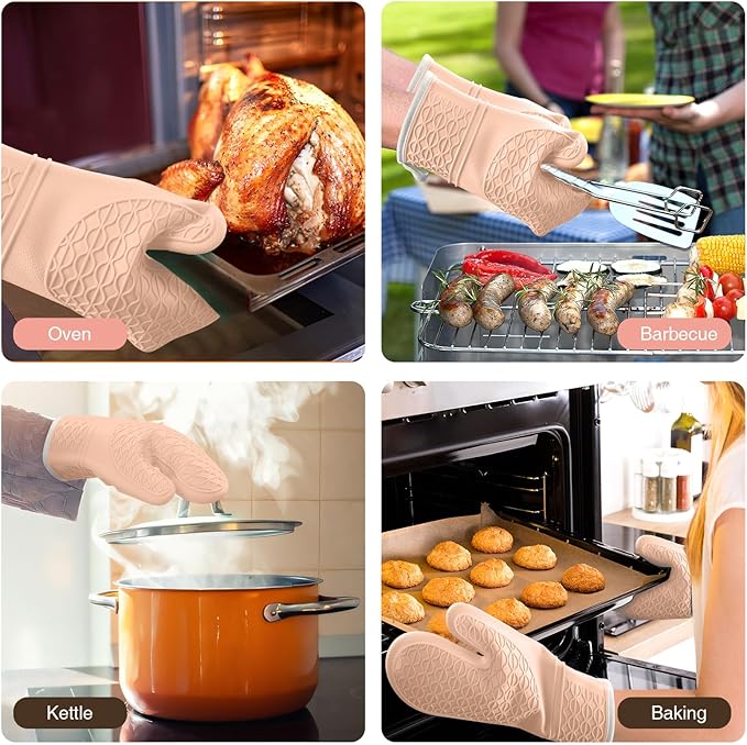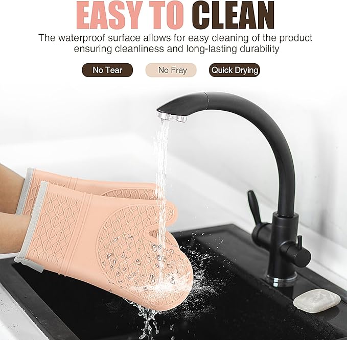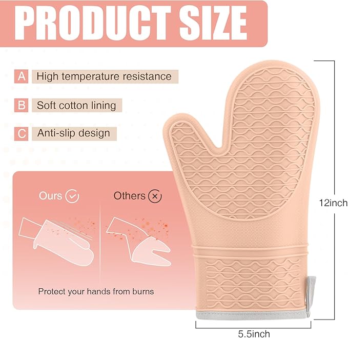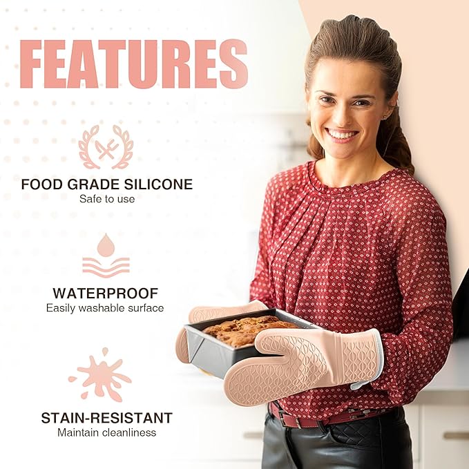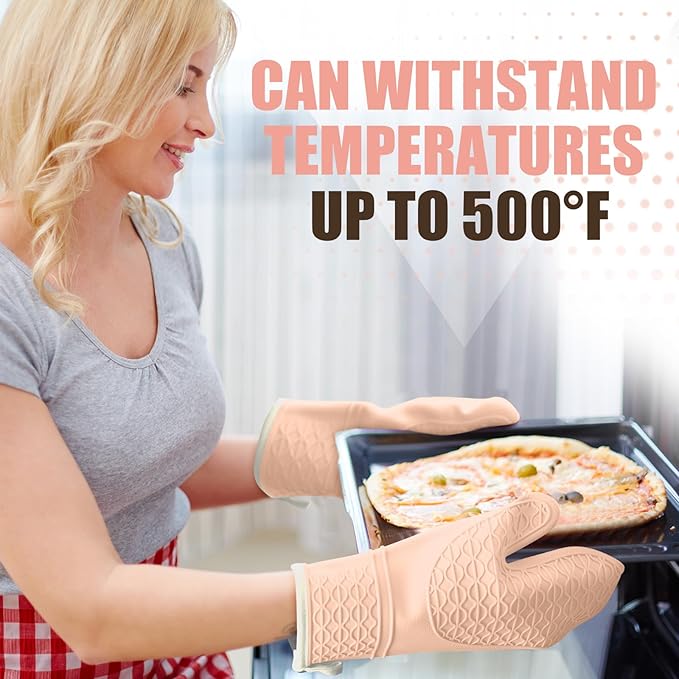 Silicone Oven Mitts, Heat Resistant 2PCS Oven Mitts with Soft Cotton Lining, Waterproof Non-Slip Grip Oven Glove, Kitchen Potholder Mits for BBQ, Baking, Cooking, 12.5 Inch - Pink
