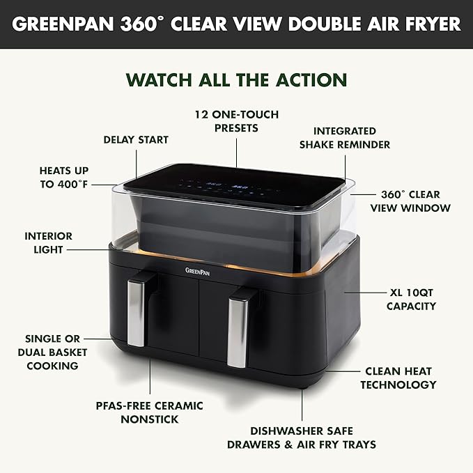 GreenPan Clearview 10QT Double Air Fryer, 360° Clear Window, PFAS-Free Ceramic Nonstick 5QT Drawers & Trays, Dual Cooking, 12-Presets, Shake Reminder, Keep Warm, Dishwasher Safe Parts
