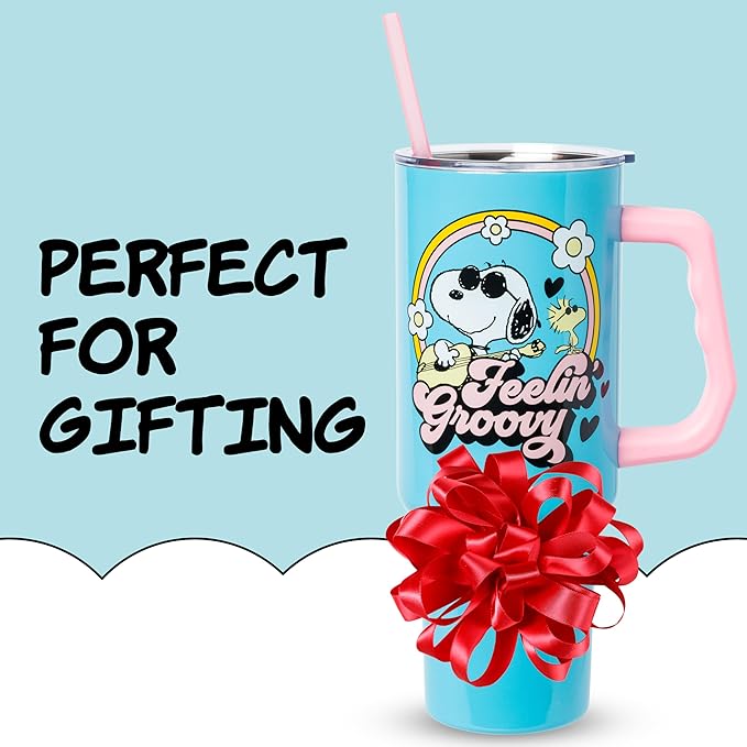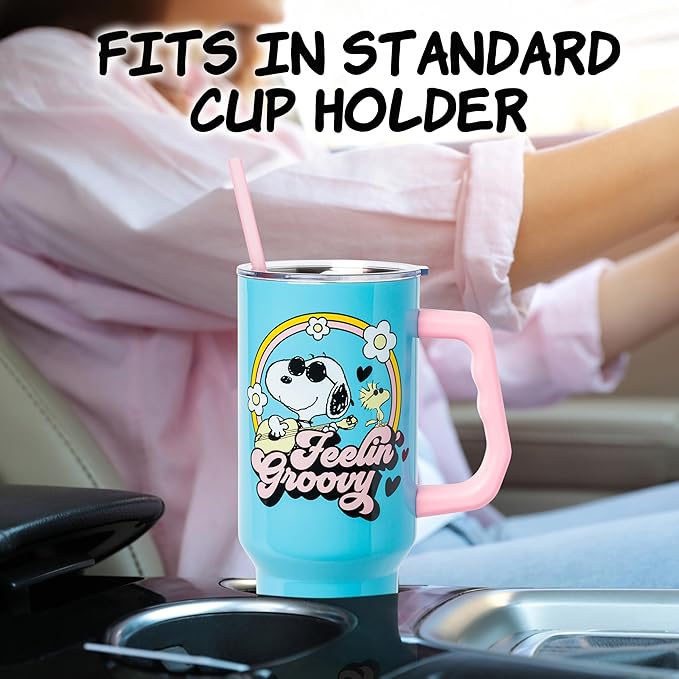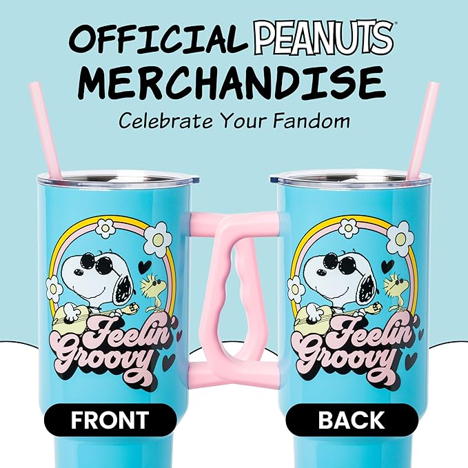 Silver Buffalo Peanuts Featuring Snoopy and Woodstock Feelin' Groovy Stainless Steel Tumbler with Handle and Straw, Fits in Standard Cup Holder, 40 Ounces