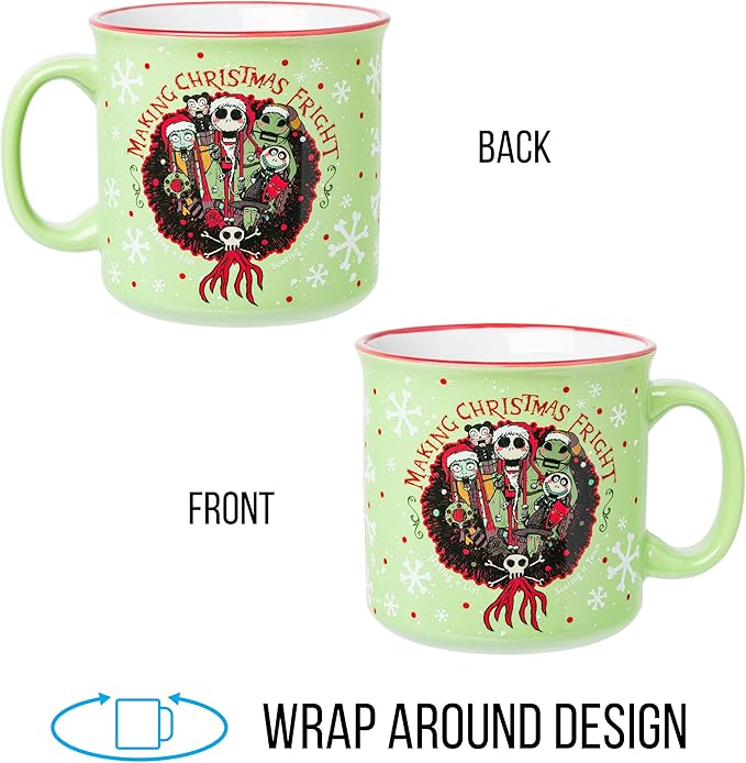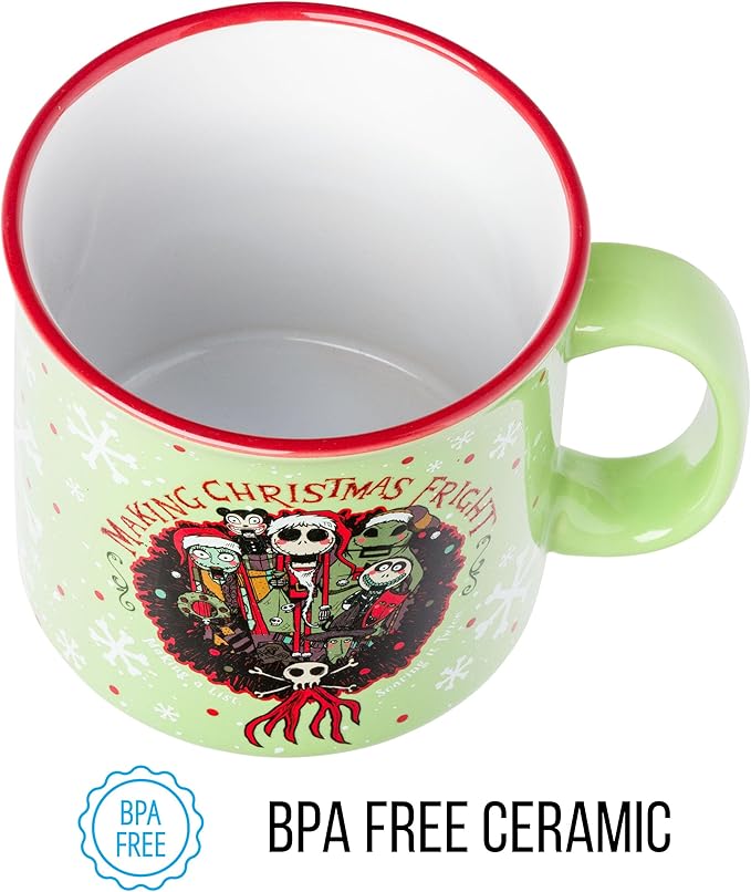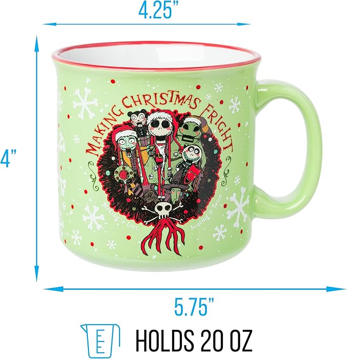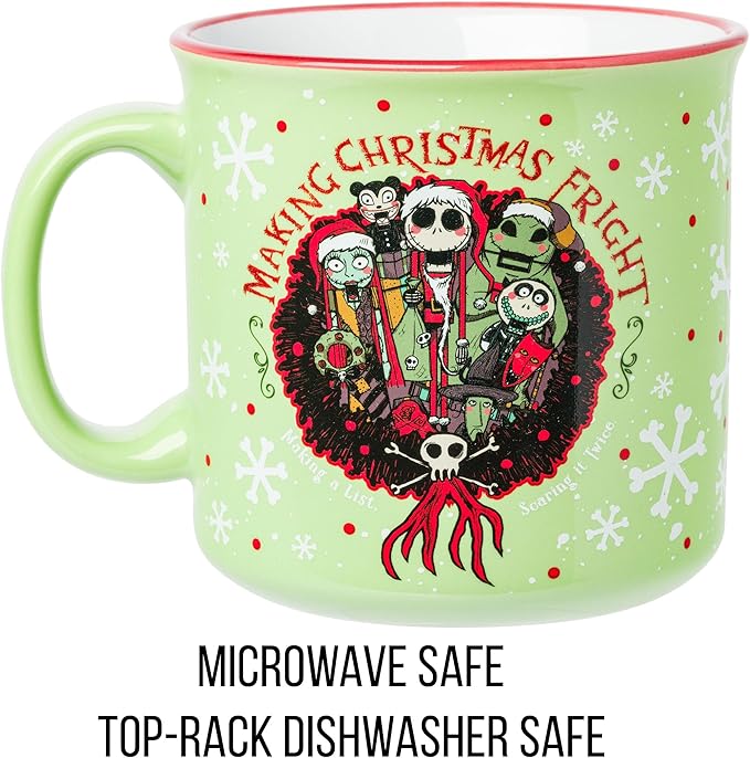 Silver Buffalo Disney Nightmare Before Christmas Making Christmas Fright Featuring Jack Skellington, Sally, Oogie Boogie, Shock, Barrel, and Scary Teddy Ceramic Camper Mug, 20 Ounces