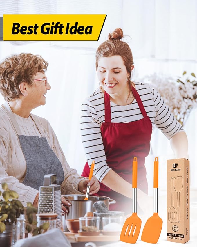Pack of 2 Silicone Solid Turner, Non Stick Slotted Kitchen Spatulas, High Heat Resistant BPA Free Cooking Utensils, Ideal Cookware for Fish, Eggs, Pancakes (ORANGE)