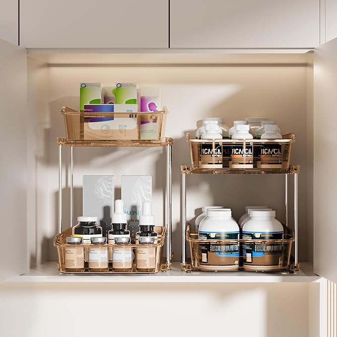 Delamu 2-Tier Under Sink Organizers and Storage, Multi-Purpose Stackable Bathroom Cabinet Organizers, Pull Out Kitchen Pantry Organization and Storage with Dividers(2 Pack, Amber)