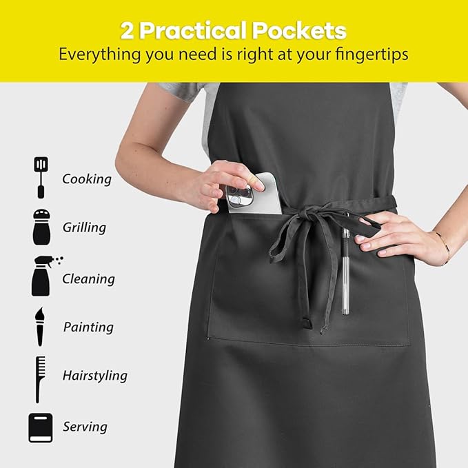 • 2 POCKETS: The apron features two large center pockets, measuring 6"W * 7"L, making it convenient to put in and take out items such as pens, recipes, phone, towel, or other accessories that you may need when using this bib apron