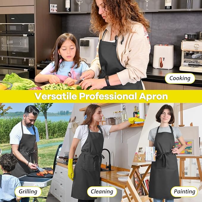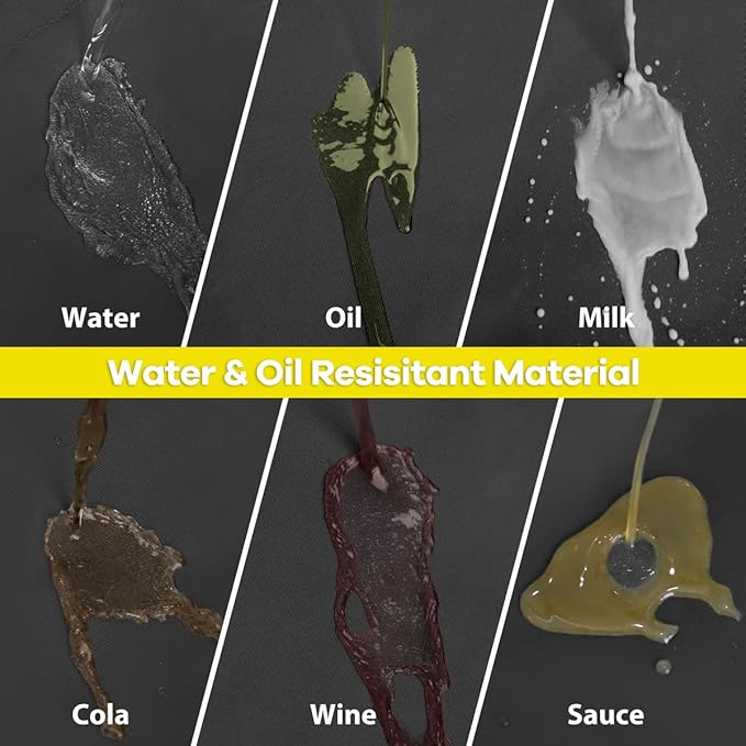 • UNIQUE MATERIAL: Our aprons use the fabric with Water & Oil Resistant coating keeps you safe from kitchen grease and other dirt. The 35% cotton and 65% polyester blend which prevents wrinkles and pilling,ensures comfortable wear
