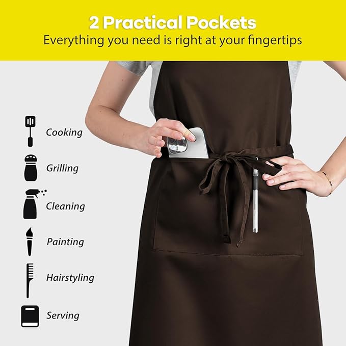 • 2 POCKETS: The apron features two large center pockets, measuring 6"W * 7"L, making it convenient to put in and take out items such as pens, recipes, phone, towel, or other accessories that you may need when using this bib apron