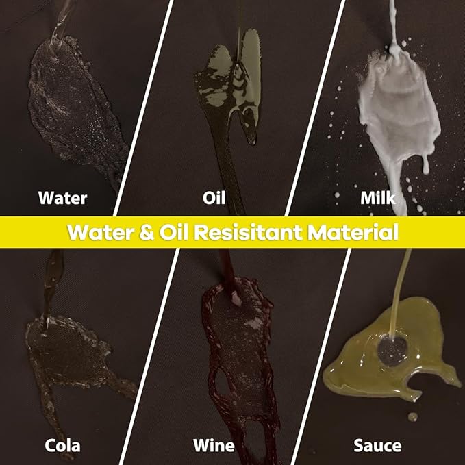 • UNIQUE MATERIAL: Our aprons use the fabric with Water & Oil Resistant coating keeps you safe from kitchen grease and other dirt. The 35% cotton and 65% polyester blend which prevents wrinkles and pilling,ensures comfortable wear