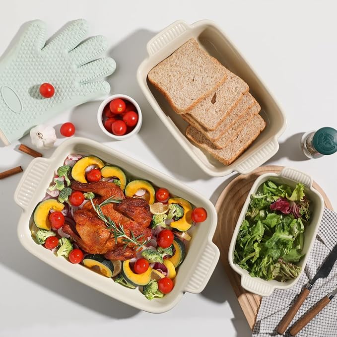 Sweejar Baking Pans Set, Ceramic 9x13 Baking Dish with Handle, Rectangular Casserole Dishes for Oven, Bakeware Sets of 3, Durable Lasagna Pan Deep for Kitchen, Banquet, Wedding Gift(Beige)