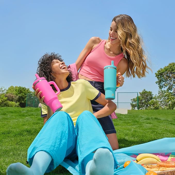 ENCOOL 40 oz Tumbler with Handle and Straw: Stainless Steel Insulated Tumbler Keeps Cold for 24 Hours, Leakproof Travel Cup Fits in Cup Holder and BPA-Free,Persian Rose