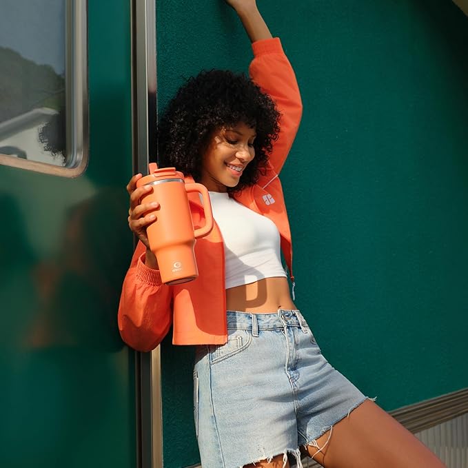 32 oz Tumbler with Handle and Straw: Stainless Steel Insulated Tumbler Keeps Cold for 24 Hours, Leakproof Travel Cup Fits in Cup Holder and BPA-Free,Moderate Orange