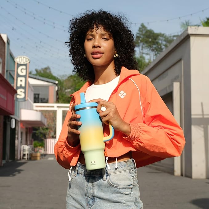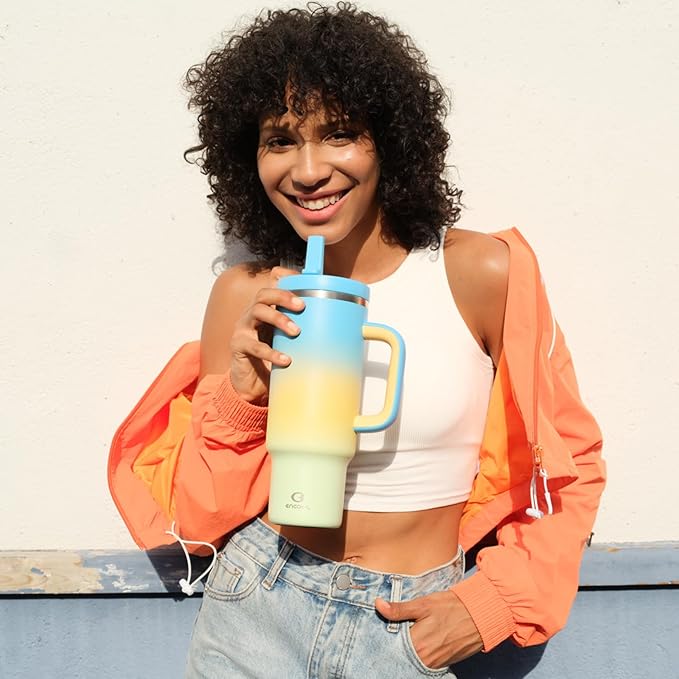 ENCOOL 32 oz Tumbler with Handle and Straw: Stainless Steel Insulated Tumbler Keeps Cold for 24 Hours, Leakproof Travel Cup Fits in Cup Holder and BPA-Free, Sunny Breeze