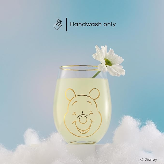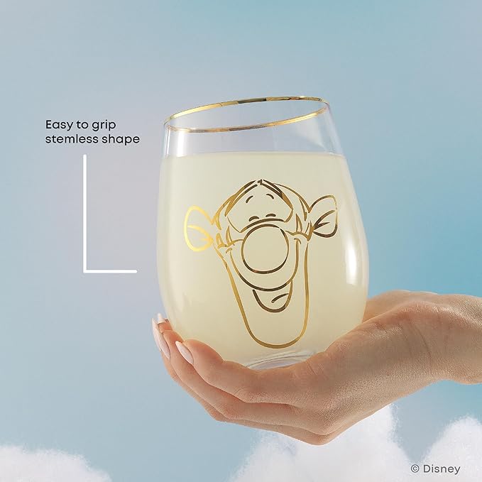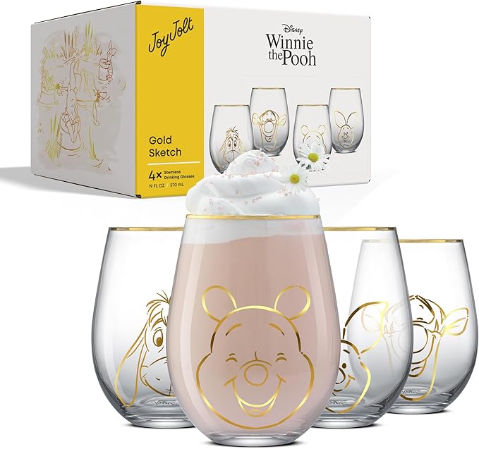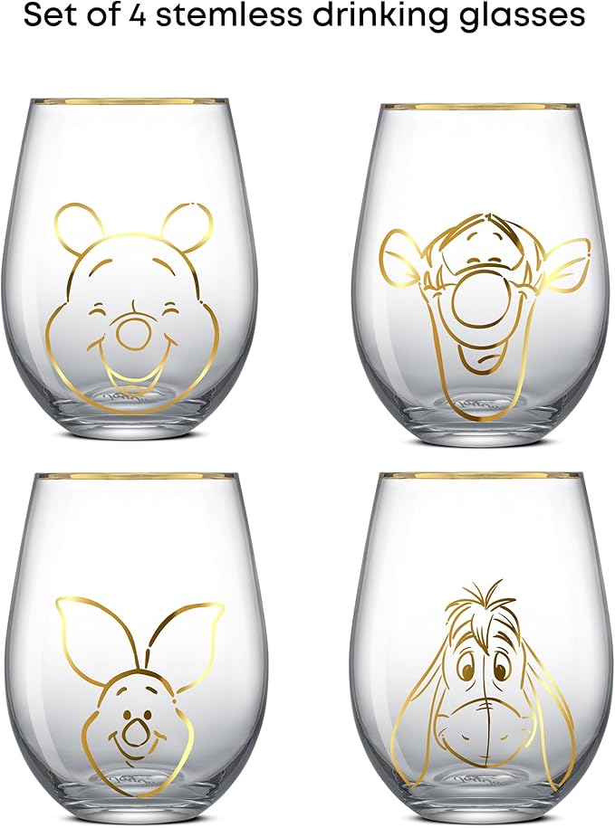 JoyJolt Disney Winnie the Pooh Gold Sketch Stemless Drinking Glasses Set of 4, 19oz Glass Cups ft Pooh Bear Tigger Piglet Eeyore, Disney Kitchen Glassware Set, Winnie the Pooh Adult Gifts