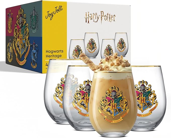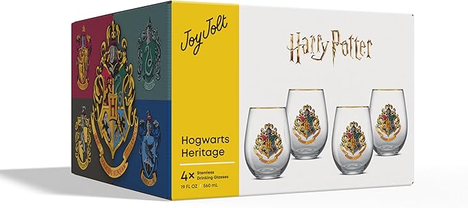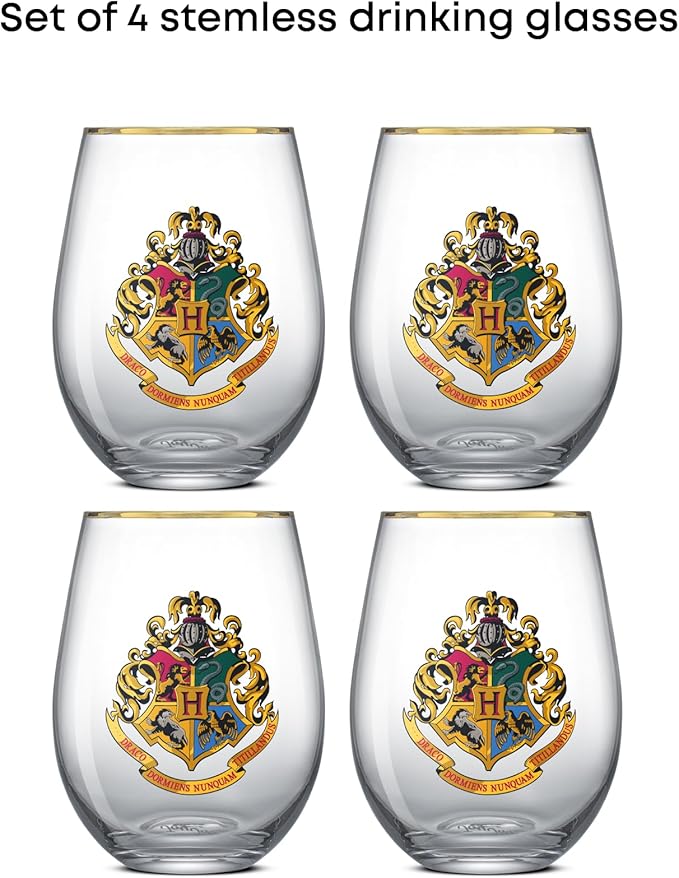 JoyJolt Harry Potter Hogwarts Heritage Stemless Drinking Glasses, 19oz Glass Tumblers, Teardrop Glass Drinking Glasses Set of 4, Hogwarts Cup, Harry Potter Gifts for Adults