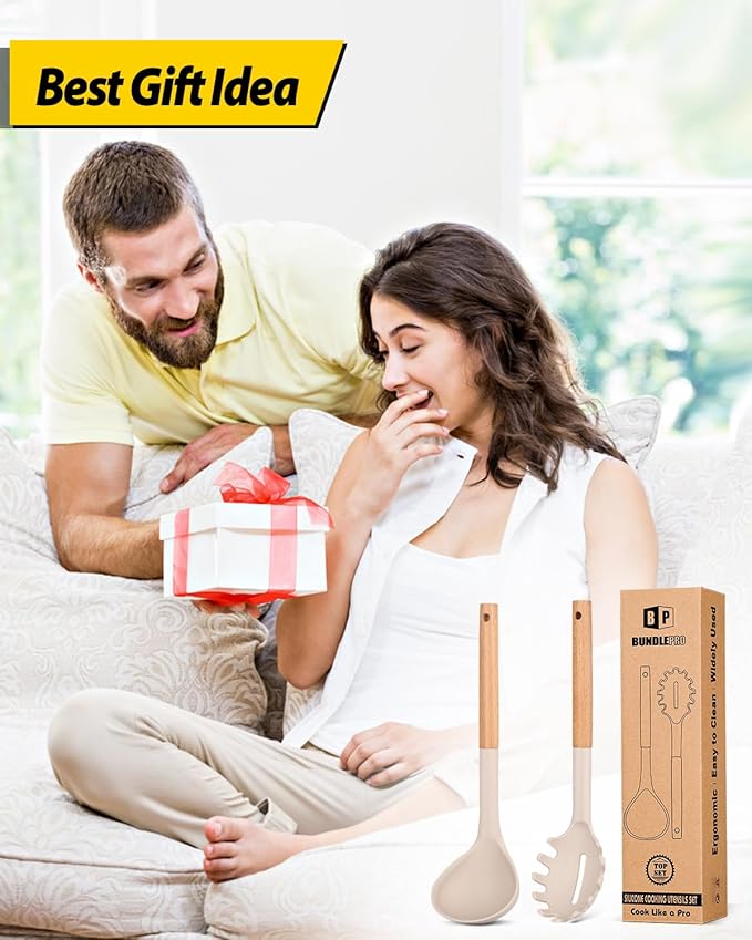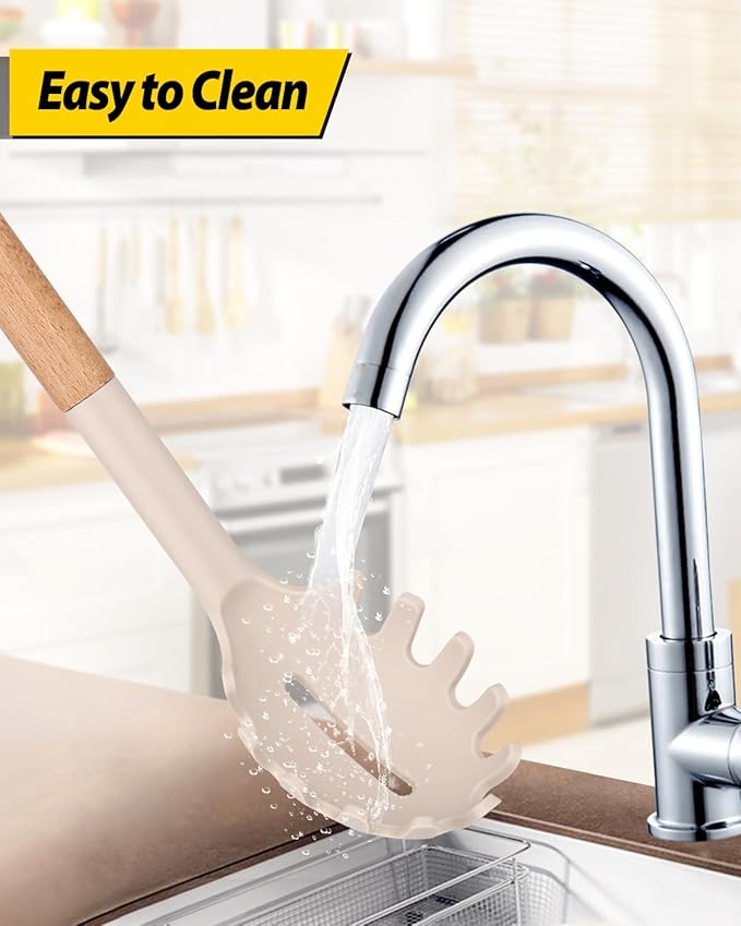 Silicone Pasta Fork and Ladle Spoon Set with Wooden Handle, Heat Resistant Non Stick Kitchen Utensils for Cooking, Stirring, Serving Spaghetti, Soup, Sauce(KHAKI)