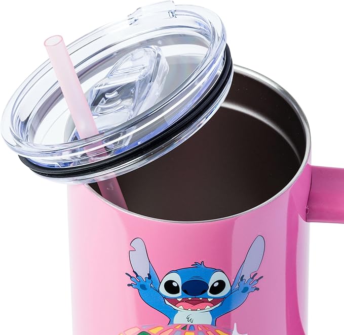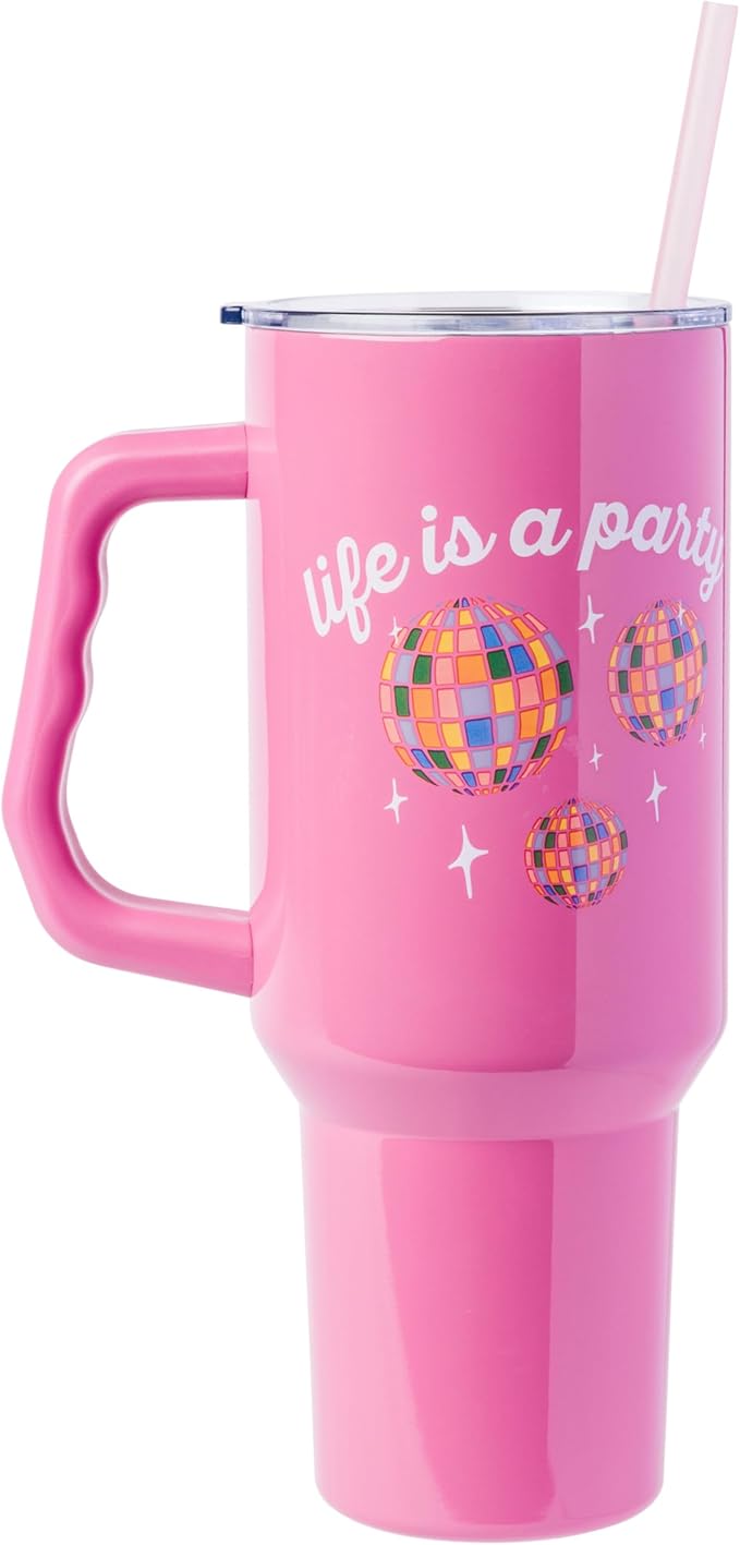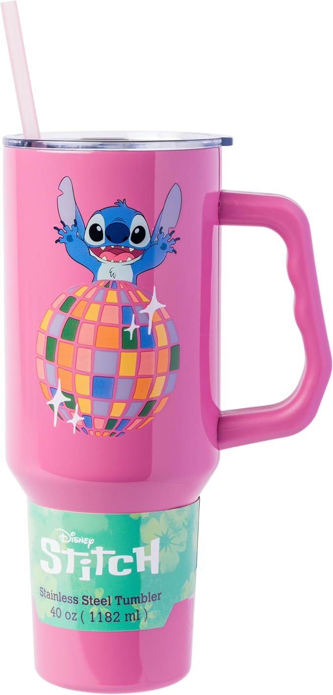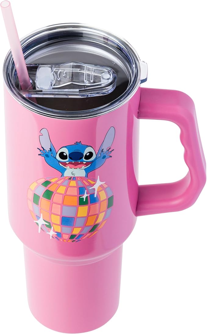 Silver Buffalo Disney Lilo and Stitch Life is a Party Disco Ball Stainless Steel Tumbler with Handle and Straw, Fits in Standard Cup Holder, 40 Ounces