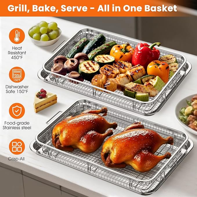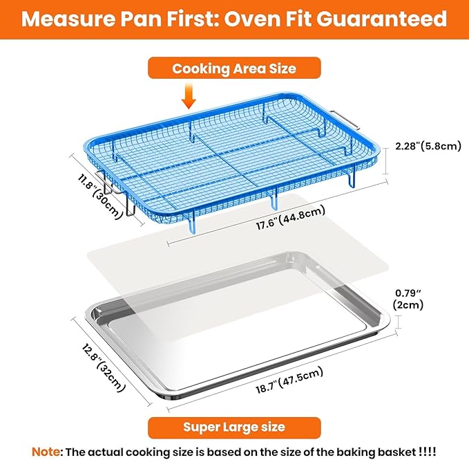 Extra Large Air Fryer Basket for Oven, 18.7"x12.8" Stainless Steel Baking Pan & Crisper Tray, Fits Whole Chicken, Commercial-Grade Oven Air Fryer with 30 Parchment Papers, Dishwasher Safe