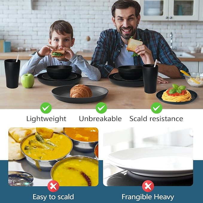 Teivio 40-Piece Kitchen Plastic Wheat Straw Dinnerware Sets, Service for 4, Dinner Plates,Dessert Plates,Cereal Bowls, Cups, Flatware,Dishwasher Safe, Unbreakable Outdoor Camping Dishes, Black