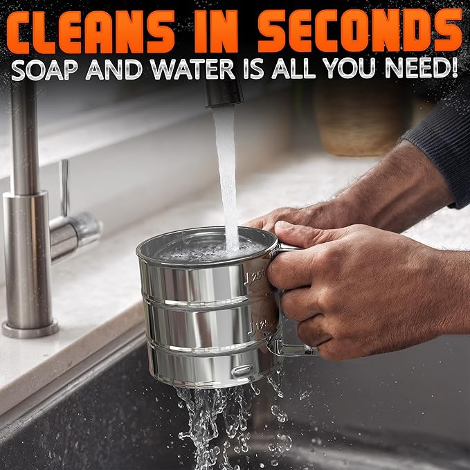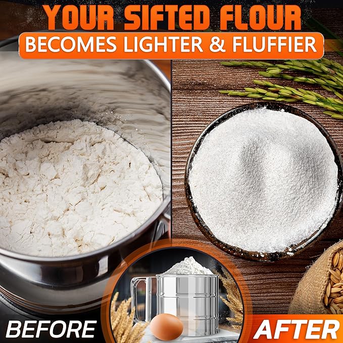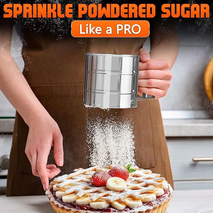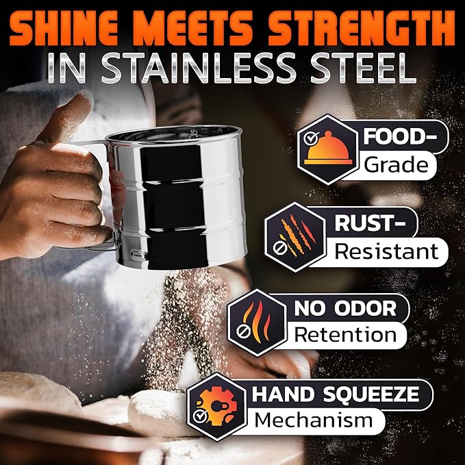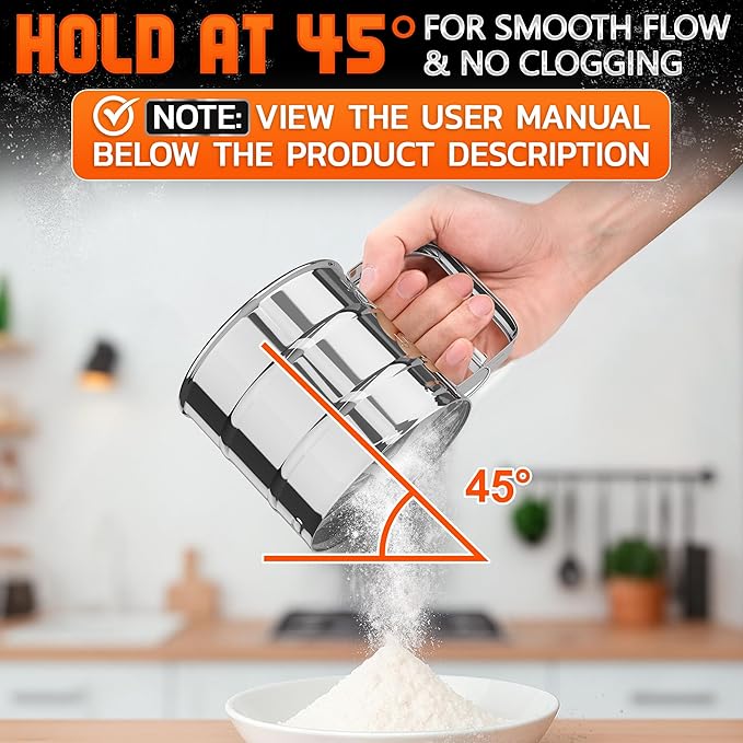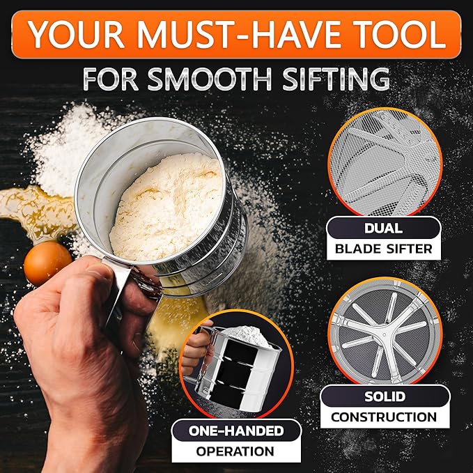 Flour Sifter for Baking – 3 Cup Flour Sifter Stainless Steel with Dual-Blade, Ergonomic Handle, Reinforced Base, Rust-Resistant and Easy to Wash – For Powdered Sugar, Cocoa, and Daily Baking Tasks