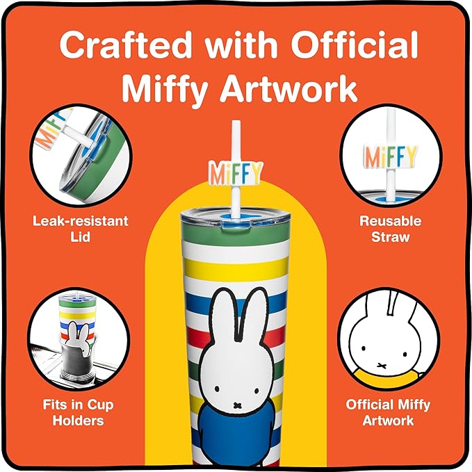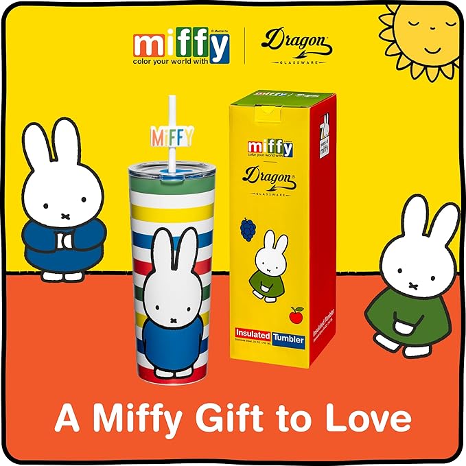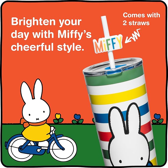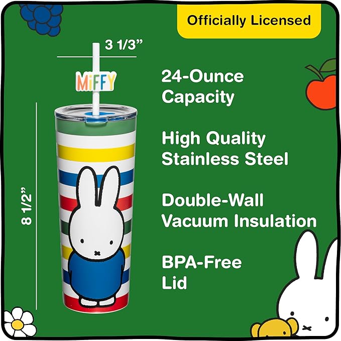 Dragon Glassware | Miffy 24 oz Vacuum Insulated Tumbler with Lid and Straw - Tumbler Cup with 2 Straws - Stainless Steel Tumbler with Straw Topper for Water, Iced Tea - Stripes