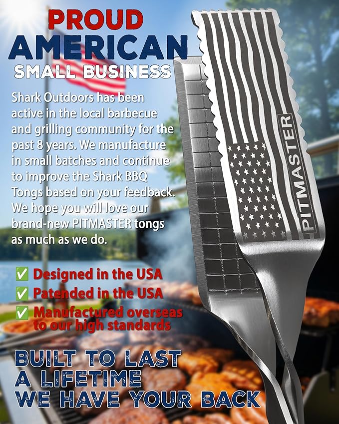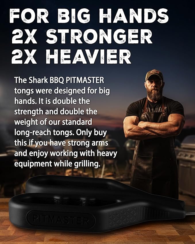 Shark BBQ Pitmaster Grill Tongs, 2X Stronger, Heavy-Duty for Big Hands & Large Cuts. Long-Reach Barbecue Grilling Tongs. Premium Stainless Steel Tong (Black)