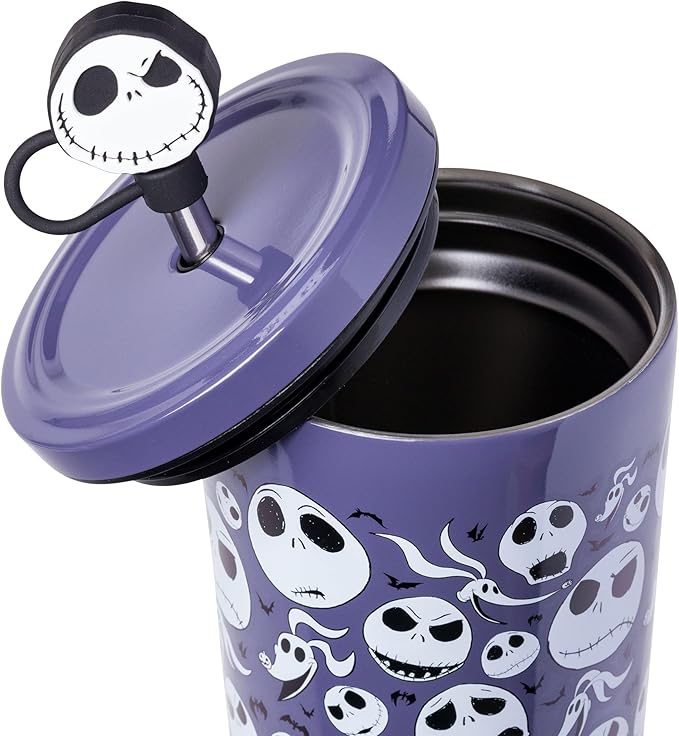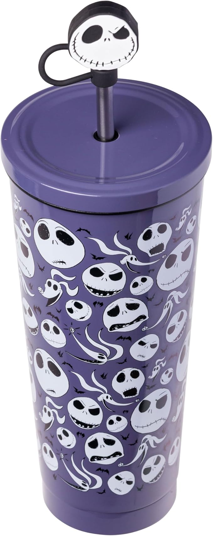 Silver Buffalo Disney Tim Burton's Nightmare Before Christmas Featuring Jack Skellington, Zero, and Bats Stainless Steel Tumbler with Straw and Cover Cap to Prevent From Spilling, 24 Ounces