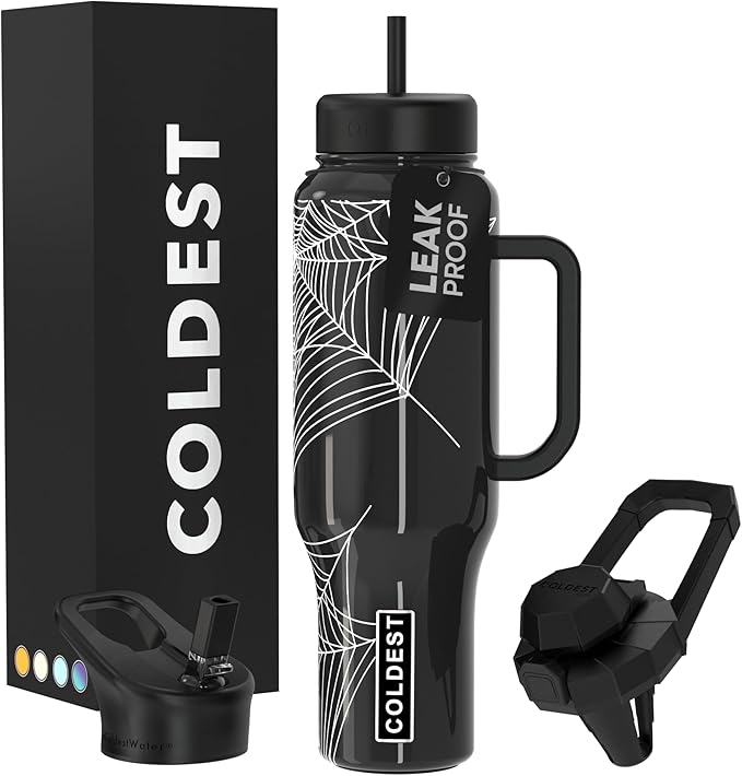 Coldest Tumbler with Handle and Straw, 100% Leak Proof Insulated Tumbler with Lid and Straw (3 Lids), Stainless Steel Tumblers for Women & Men, Cup Holder Friendly Base, 46 oz (Haunted Webs)