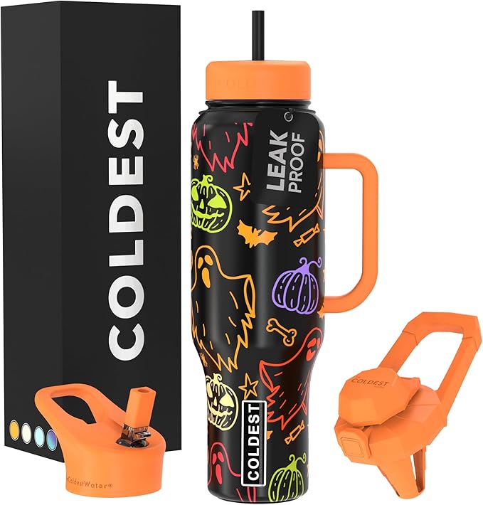 Coldest Tumbler with Handle and Straw, 100% Leak Proof Insulated Tumbler with Lid and Straw (3 Lids), Stainless Steel Tumblers for Women & Men, Cup Holder Friendly Base, 46 oz (Eerie-sistible)