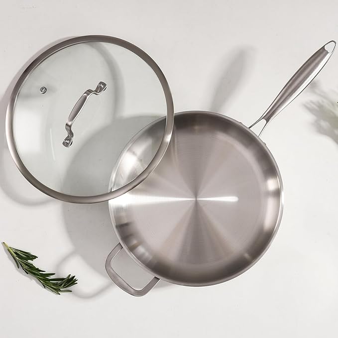 DELARLO Stainless Steel Pan, 14.2 Inch Frying Pan, Tri-Ply Skillet with Lid, Oven Safe Up to 600℉, Stainless Steel Cookware, Fast Even Heat, Large Cooking Surface,Non Toxic Large Skillet