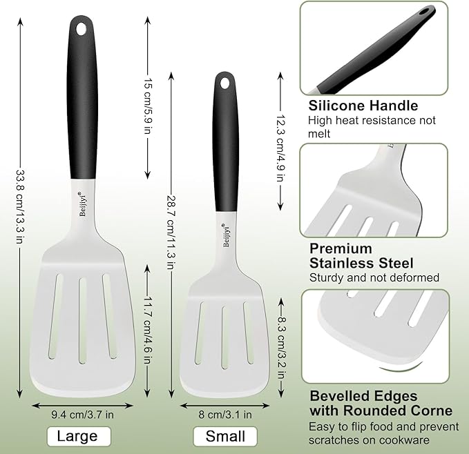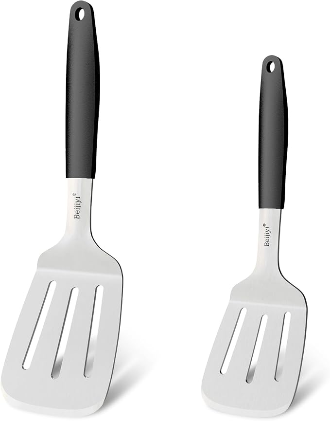 Beijiyi 2-Piece Stainless Steel Spatula Set, 13.3" & 11.3" Slotted Turner, Heavy Duty Metal Spatulas for Cast Iron Skillet and Grilling Cooking with Silicone Handle, Flipper for Steak, Burger and Eggs
