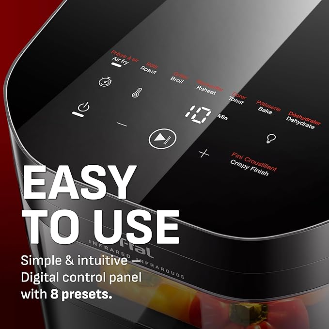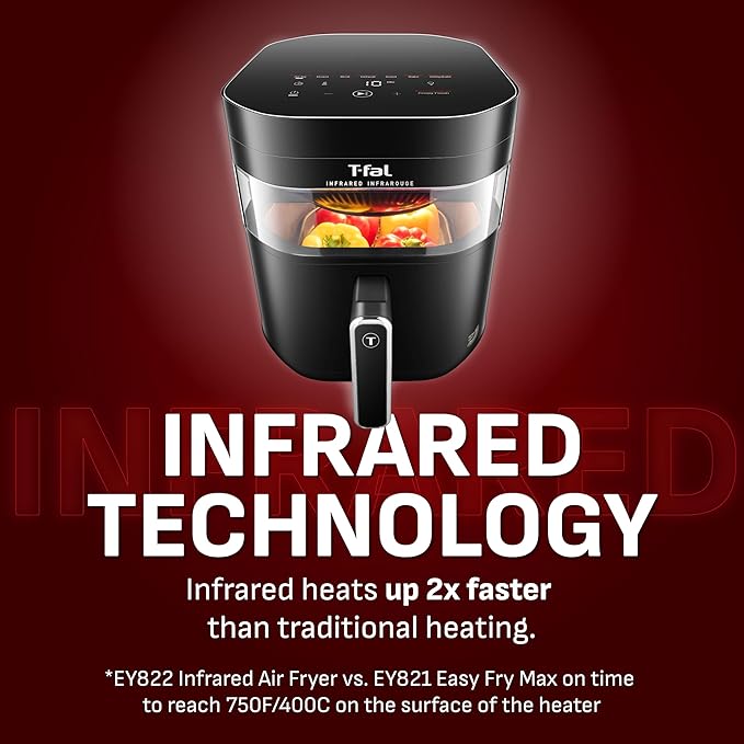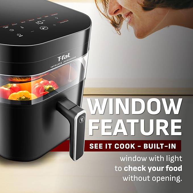 T-fal Infrared Air Fryer, 2x Faster Than Traditional Heating*, Large Air Fryer Dehydrator Combo, 8 Cooking Functions, Window With Light, No-Shake Technology, Dishwasher Safe, 1800W, Black