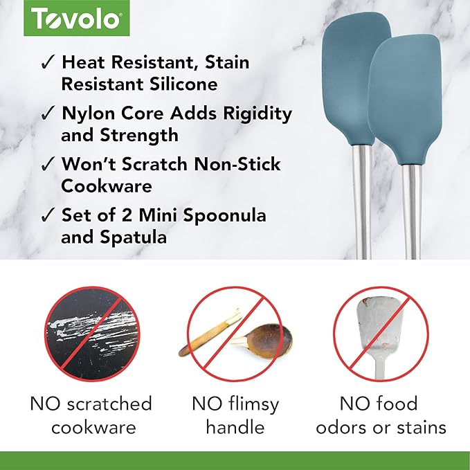 Tovolo Flex-Core Stainless Steel Handled Mini Spatula & Spoonula Set of 2, Kitchen Utensil Set, BPA-Free Silicone, Safe for Cast Iron & Cookware Dishwasher-Safe