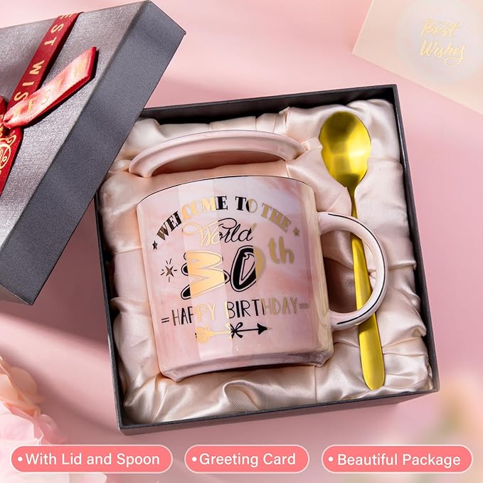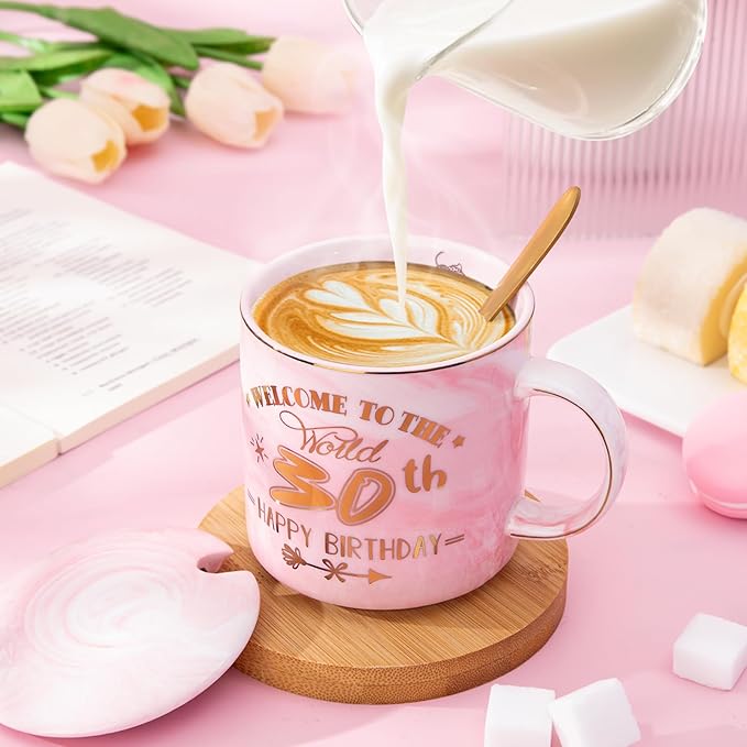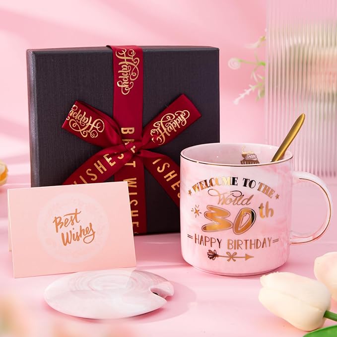 30th Birthday Gifts for Women, Unique Happy 30 Year Old Birthday Gifts Ideas for Women, Wife, Mom, Daughter, Sister, Aunt, Best Friends, BFF, 14Oz Fabulous Pink Marble Mug with Gold Pattern, Gift Box