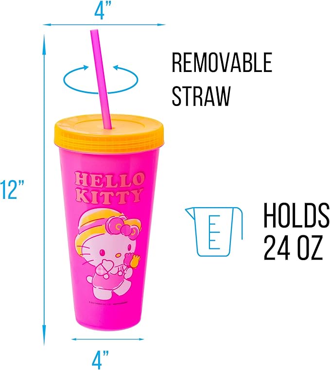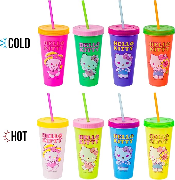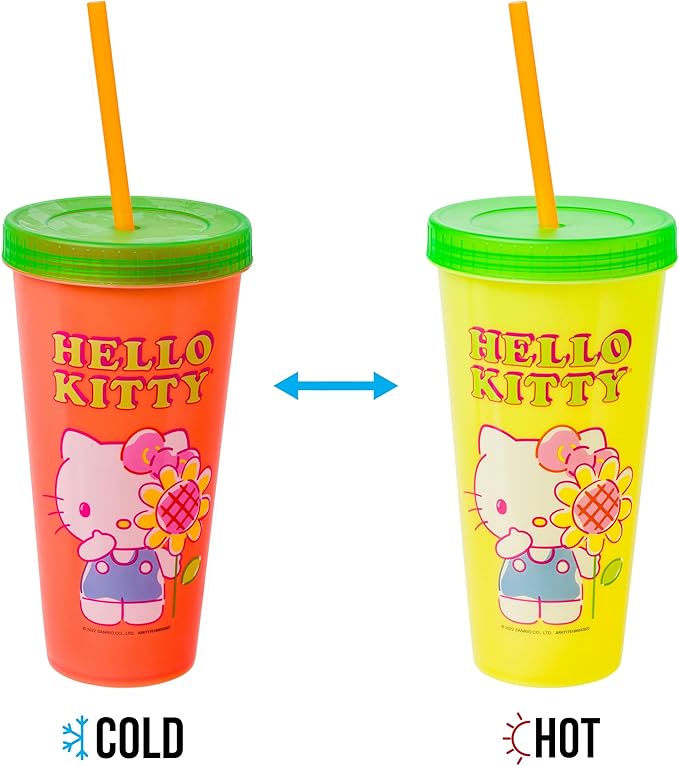 Silver Buffalo Sanrio Hello Kitty Summertime Gardening Color Changing Plastic Tumblers Includes Lid and Straw, 24 Ounces (Pack of 48)