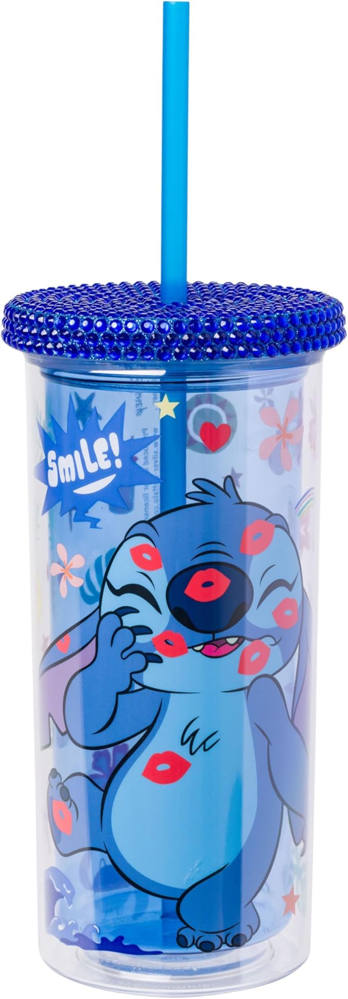 Silver Buffalo Lilo and Stitch Smiles Kisses and Icons Rhinestone Lid 20oz Plastic Tall Cold Cup w/Lid and Straw