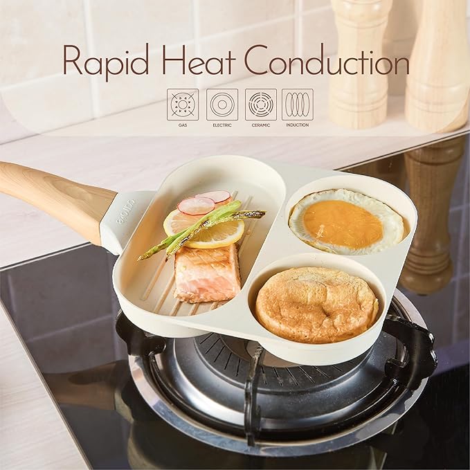 CAROTE Egg Pan Omelette Pan, 3-In-1 Divided Nonstick Grill Pan, Pancake Pan and Healthy Egg CookerSuitable for Gas Stove & Induction Cookware, White Granite
