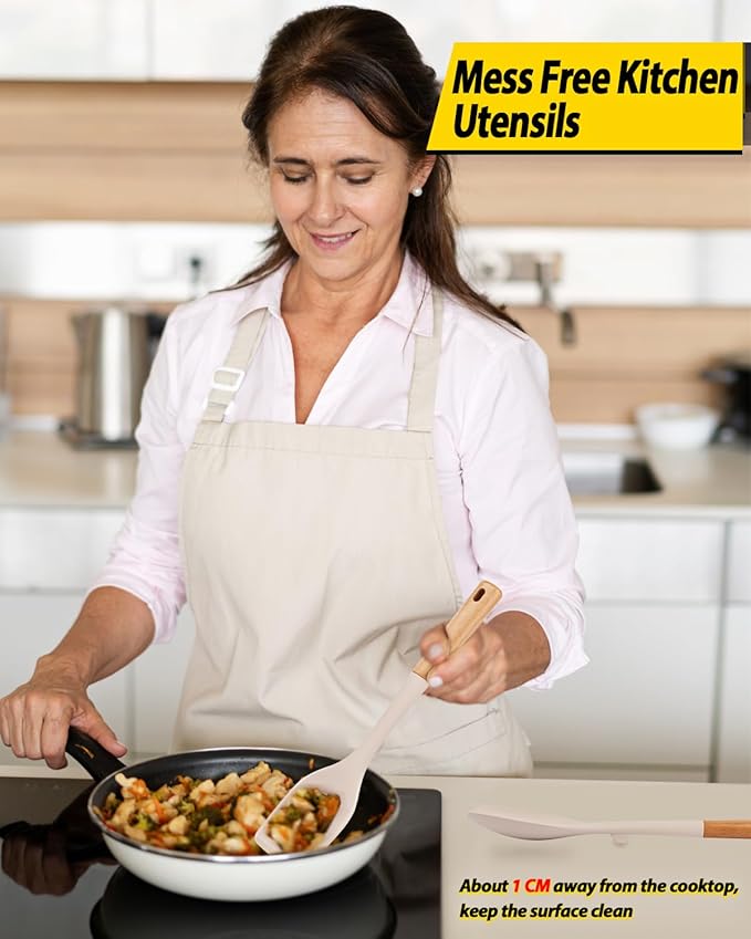 Pack of 4 Silicone Kitchen Utensils Set, Non Stick Solid Spatulas and Heat Resistant Slotted Spoons with Wooden Handle, Ideal BPA Free Cooking Utensils for Mixing,Serving,Turning,Stirring(KHAKI)