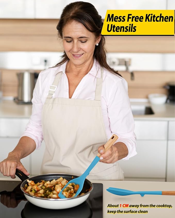 Pack of 4 Silicone Kitchen Utensils Set, Non Stick Solid Spatulas and Heat Resistant Slotted Spoons with Wooden Handle, Ideal BPA Free Cooking Utensils for Mixing,Serving,Turning,Stirring(BLUE)