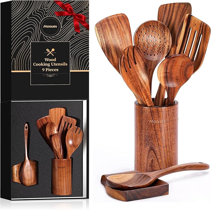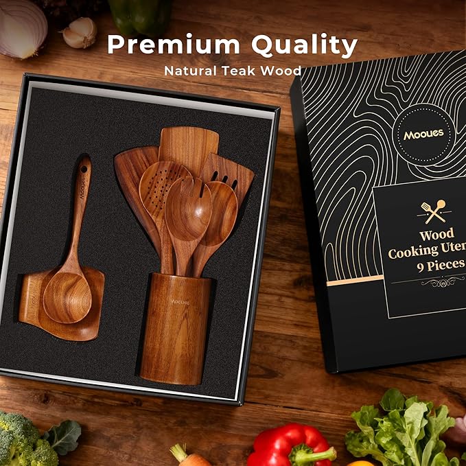 9pc Teak Wooden Utensils - Natural Teak Cooking Utensils with Premium Gift Box - Kitchen Gift Set