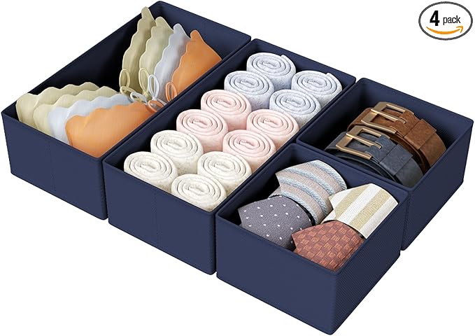 DIMJ Drawer Organizers Clothes, Set of 4 Dresser Organizer Bins, Fabric Closet Organizers and Storage, Shallow Drawer Dividers for Nursery, Clothing, Baby Clothes, Socks, Underwears, Tie (Navy Blue)