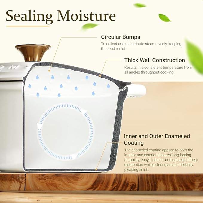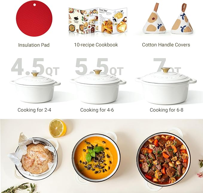 Overmont Enameled Cast Iron Dutch Oven - 5.5QT Pot with Lid Cookbook & Cotton Potholders - Heavy-Duty Cookware for Braising, Stews, Roasting, Bread Baking Pearl White
