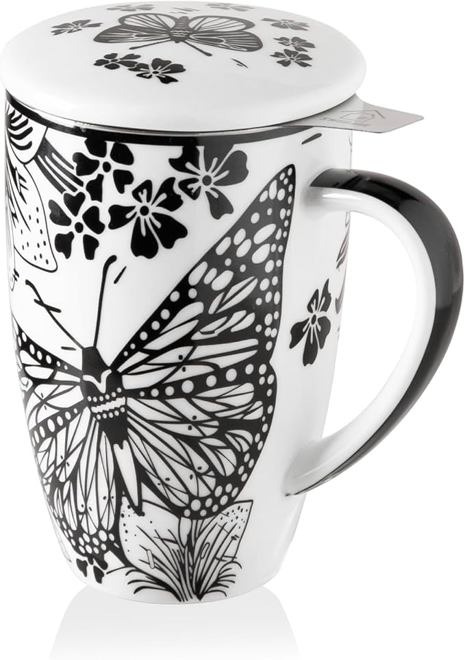 Sweejar Porcelain Tea Infuser Mug with Lid, 16 oz Teacup with Strainers for Loose Leaf Tea, Microwave and Dishwasher Safe Coffee Mug(Onyx Wing)
