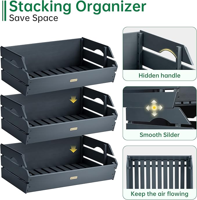 HABAU Wood Potato Onion Storage Bins - Wooden Stackable Produce Basket - Fruit Vegetable Storage for Kitchen Pantry Organization, Set 3 Pieces
