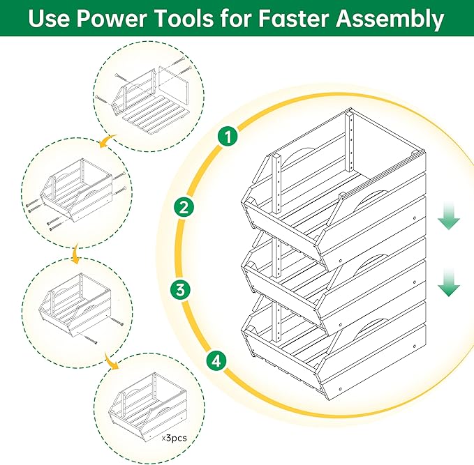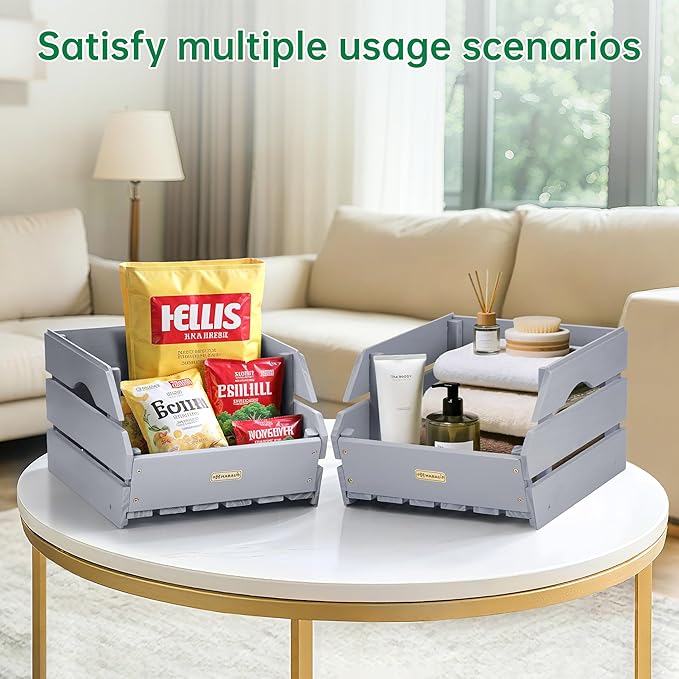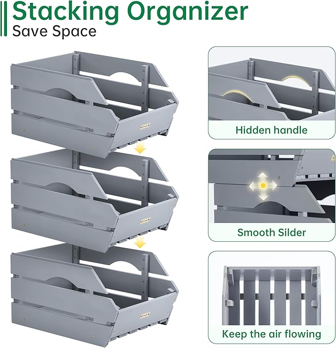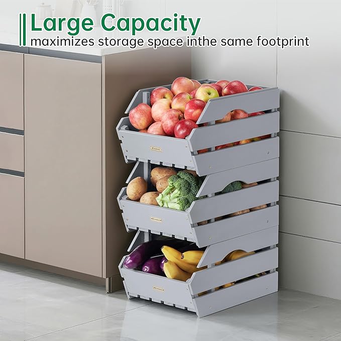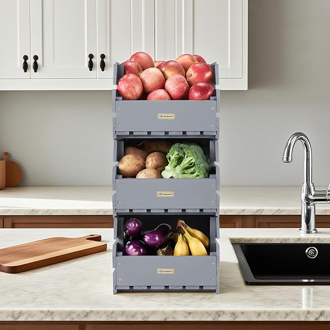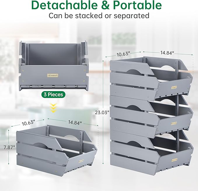 HABAU Wood Potato Onion Storage Bins - Wooden Stackable Produce Basket - Fruit Vegetable Storage for Kitchen Pantry Organization, Set 3 Pieces
