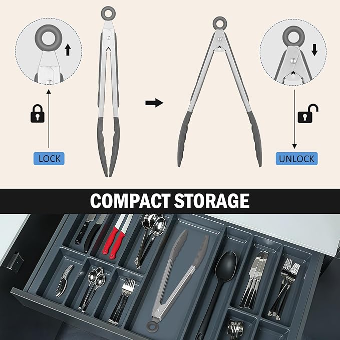 Kitchen Tongs, Set of 3 Stainless Steel Tongs with Silicone Tips Locking Cooking Tongs 600ºF Heat Resistant Tong for Cooking BBQ Grilling Air Fryer Serving Food Salads, 7"+9"+12" Light Grey