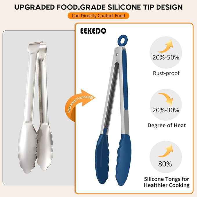 About This Premium Materials: EEKEDO kitchen tongs are constructed with food-grade stainless steel and silicone. Carbon free.Thickened stainless steel makes... Read more